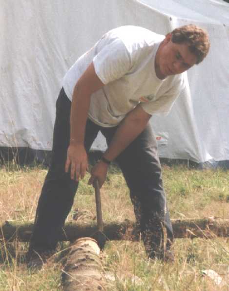 Bannermast aussuchen, fällen und aufbauen (was ohne Hilfe anderer Leiter und Gruppenkinder aber nicht möglich ist, denn was für eine Blamage wäre es, wenn der Bannermast so klein wäre, dass uns Überfäller unser